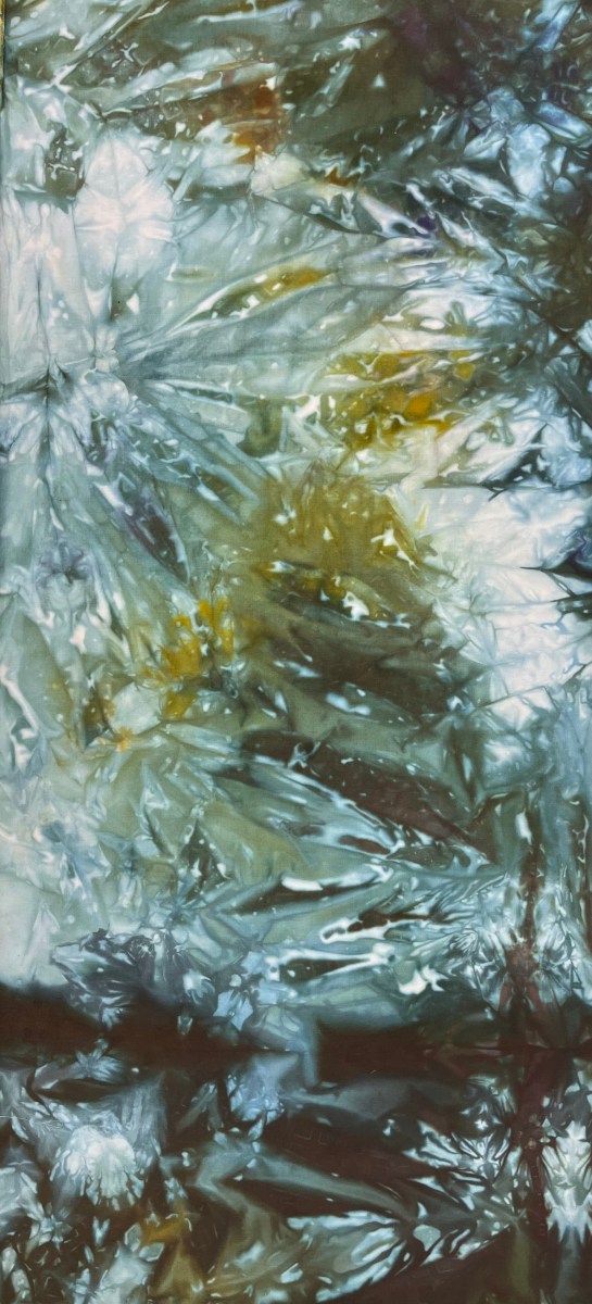 I soak cotton fabric briefly in a soda ash solution, arrange it on a baking cooling rack or similar grid and cover it with gently packed snow. I place the grid over a basin so it can drain freely overnight without making a mess.