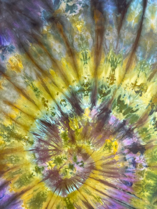 I gently sift colors of powered dye onto the item. Planning a specific design is almost impossible so I just cover the fabric with colors I like and hope for something interesting. As the snow melts it pulls the pigments through the fabric.